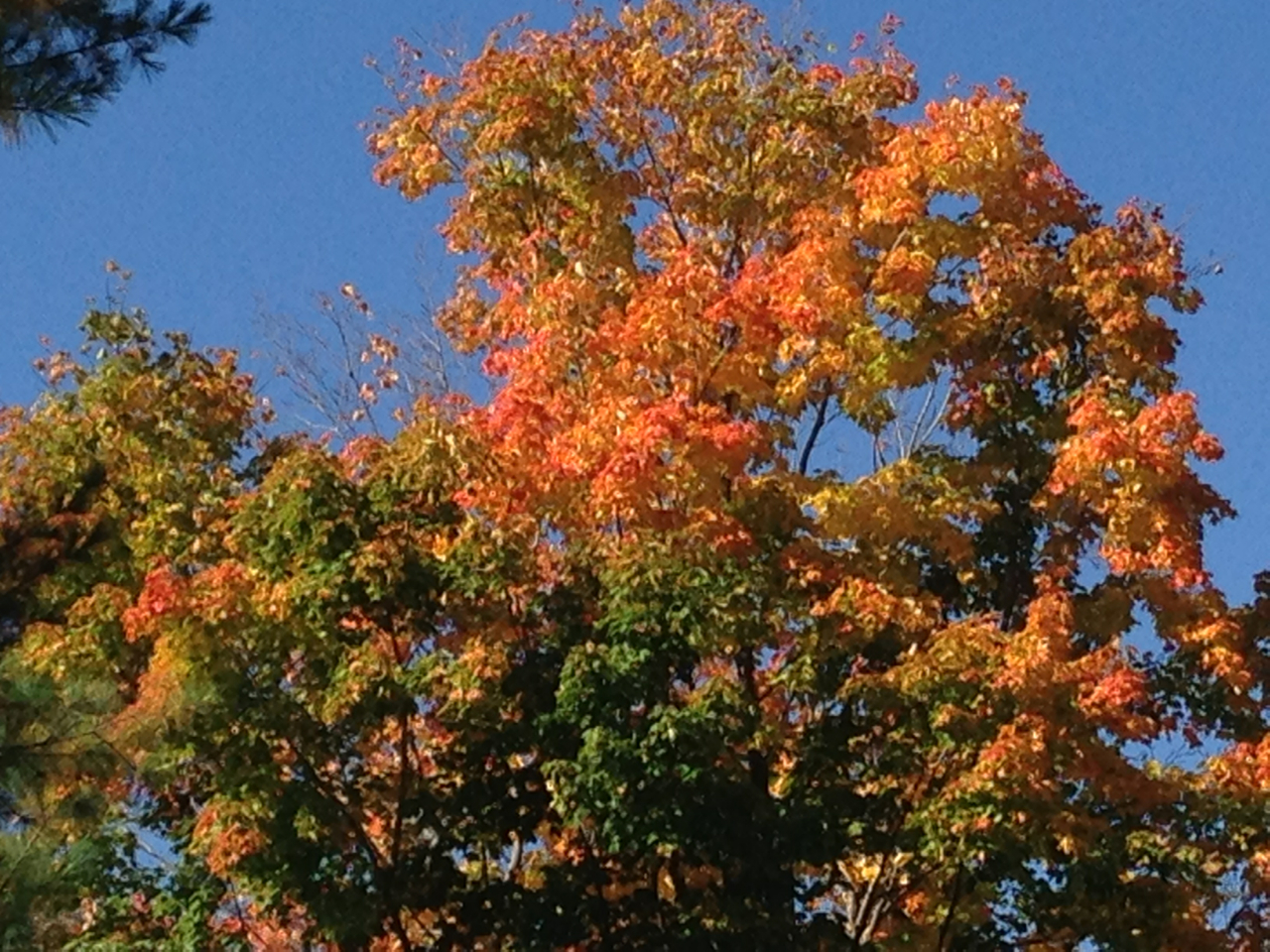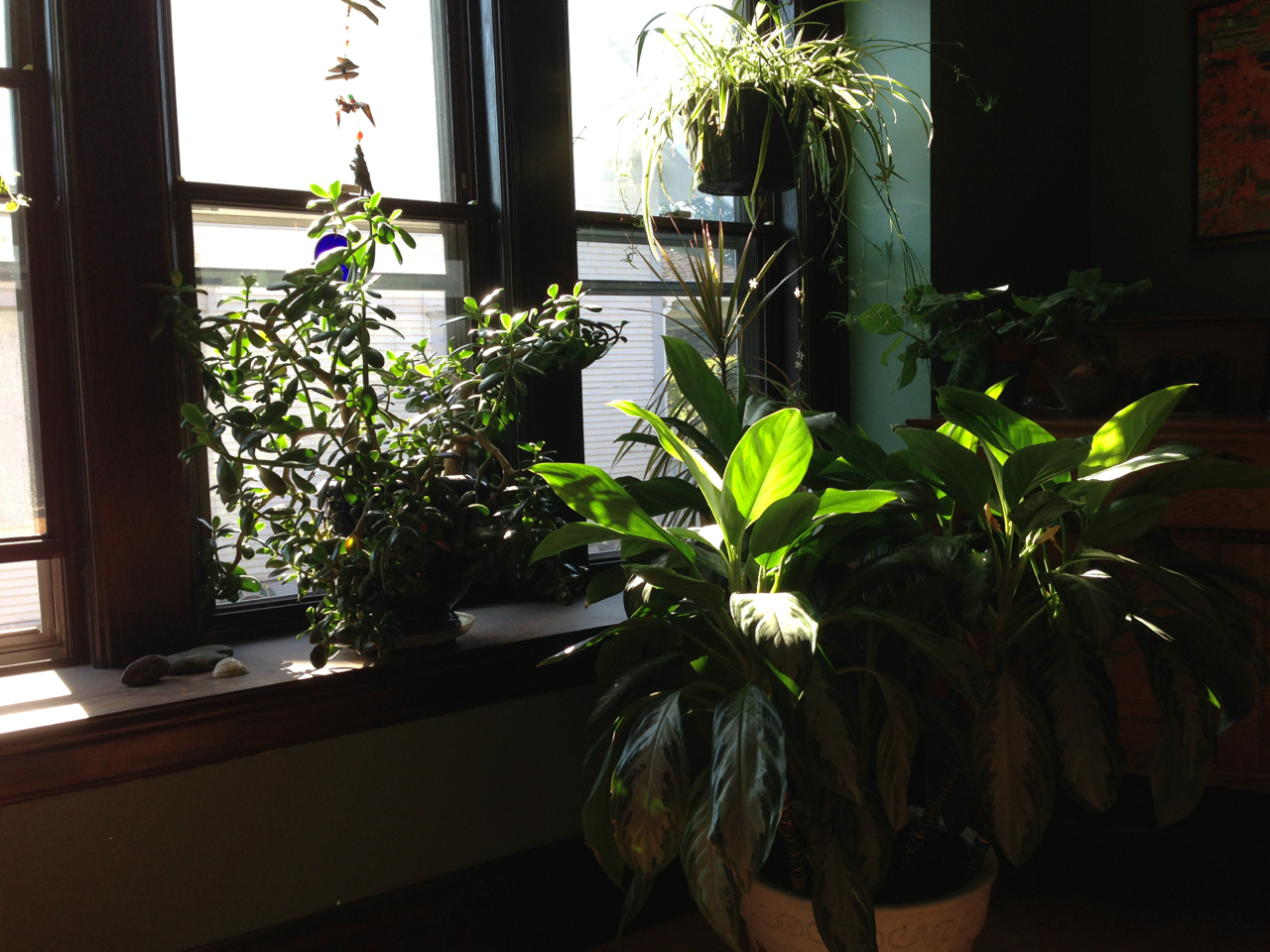 IMG_2602I nudge myself. Okay, okay—yes, the sun is shining through the dining-room windows lighting up the giant jade and the spider plant and all the other green growing things that share this space with me.  The prayer plant has opened wide and turned itself toward that light. The living-room has filled up with a rosy glow and through the windows there I see the maples flaming across the street.